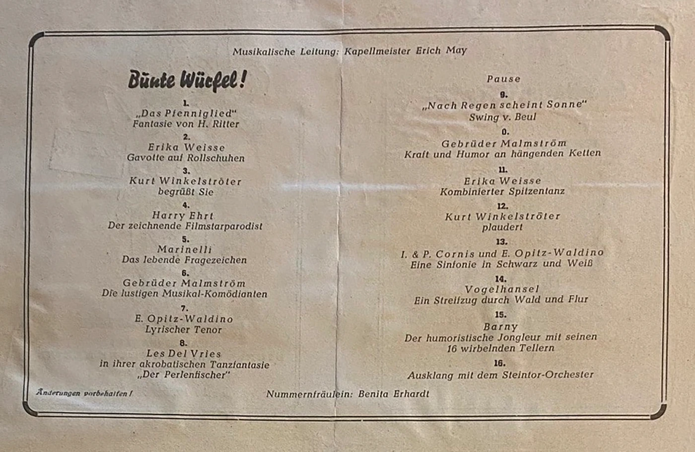 „Äußerst unterhaltsam ist der Steintor – Spielplan für die zweite Novemberhälfte, „Bunte Würfel“. … Weiter gefallen … als Musikal-Komödianten und Akrobaten die Gebrüder Malmström.“